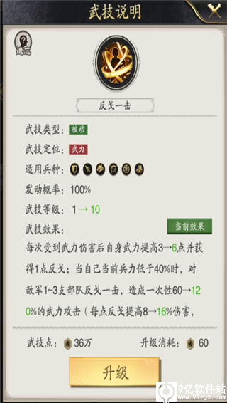 1、武技效果:每次受到武力伤害后自身武力提高3->6点(满级效果)并获得1点反戈;当自己当前兵力低于40%时,对敌军1~3支部队反戈一击,造成一次性60%->120%(满级效果)的武力攻击(每点反戈提高8%->16%伤害,最高10点)。