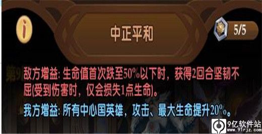 1.中心国对应的“中正平和”宝塔,在“中正平和”宝塔中,敌方在生命值首次跌至50%以下时,获得2回合坚韧不屈(受到伤害时,仅会损失1点生命)