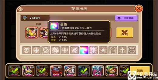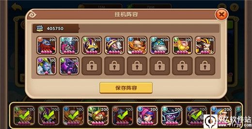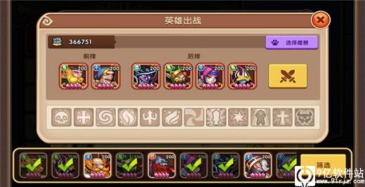 除了挂机外,在咱们的游戏中还有体验到各种各样的战斗。在进行战斗前,最重要的一步就是设置战斗的阵容了。我们可以选择想要派出的英雄,然后点击它的头像上阵,还可以拖动英雄的头像来变换英雄的站位。然后在选择魔兽那里选择想要出场的魔兽,我们的队伍阵容就设置完毕了。