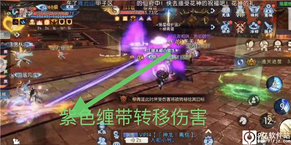 看见柳青崖释放技能出现紫色缠带时,全体停止攻击6秒等缠带消失,柳青崖“缠带转伤期间”会把所承受一切攻击和伤害转移给被缠带连上的队友,这期间攻击柳青崖会给“被缠带连着的队友”造成伤害直至死亡。