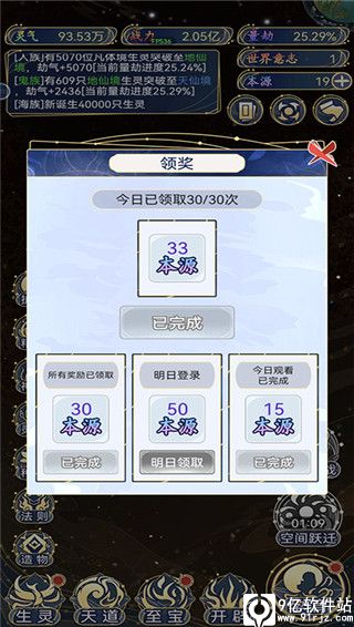 2、游戏目前有孕育、开辟、天道、至宝、生灵等玩法;