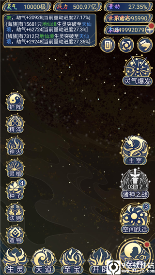 新增“福佑”玩法,可以指定某生灵种族参与提升气运层数(气运层数会影响各境生灵实力)