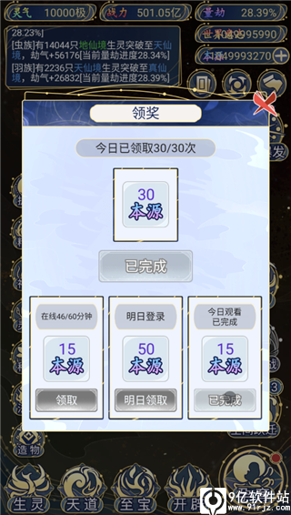 2、游戏目前有孕育、开辟、天道、至宝、生灵等玩法;