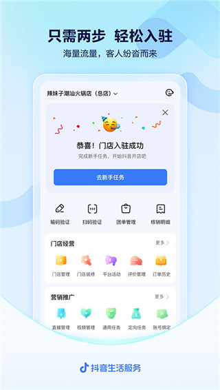 抖音来客app最新版是一款由抖音专为商户打造的店铺服务软件,当下很多店铺都采用互联网+的方式运营,而抖音作为一个用户群体庞大的平台,自然就需要这款抖音来客app了。它不仅拥有直播带货、一键认证、数据分析等等功能,可以让入驻的商家感受到最细致的运营操作,并且极大的提升你的店铺人气和销售额,帮助你更好的经营。此外,在这款软件中还可以使用抖音账号进行一键登录,将你的抖音号和店铺绑定,让你的人气全部转换了收益,感受最舒适的经营体验。如果你也拥有一家店铺,那就速来本站下载该软件,在其中去关联你的店铺开始带货吧。