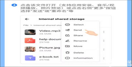 4、点击该文件打开(支持应用安装、音乐/视频播放、照片预览)或点击右侧“更多"按钮选择“发送"或“重命名"等
