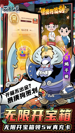在新葫芦兄弟手游变态版里,拥有大量的角色可以收集。玩家可以通过游戏的召唤玩法来收集角色,在游戏里每日还有免费赠送的召唤次数,让你不充钱也能出角色。此外,游戏内还与上美其他作品进行联动,玩家可以在游戏里获得美猴王、哪吒等经典动画片角色,这些角色还有还原的角色技能和剪纸风格的立绘,带你重新回到儿时的时光。如果你也喜欢这款游戏的玩法,那就速来本站下载新葫芦兄弟手游变态版吧。