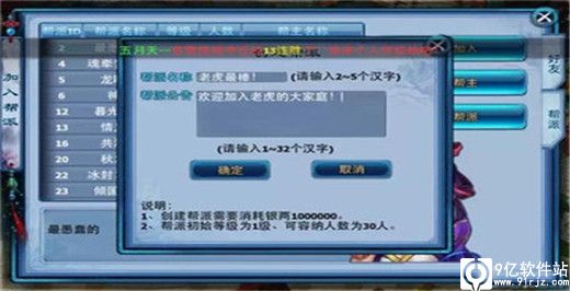 3)创建帮派需要花费100万银两,且帮派初始等级为1级,可容纳人数为30人,最高12级
