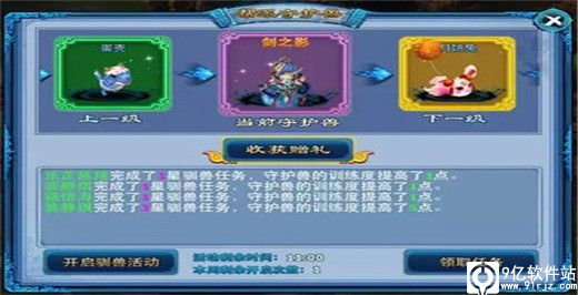 6.每周一守护兽会根据上周等级给玩家发奖励,该奖励玩家可以在守护兽界面点击收获赠礼按钮领取,领取时间为每周一至周日,奖励会随着守护兽等级提高而提高。 以上数据只供参考,最终结果以游戏为准
