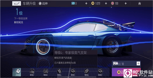 当我们完成升级后,车辆性能不仅能得到提升,还能解锁车辆的新特性。当战神达到2级,就能解锁尾流,4级能解锁2阶氮气的选装。