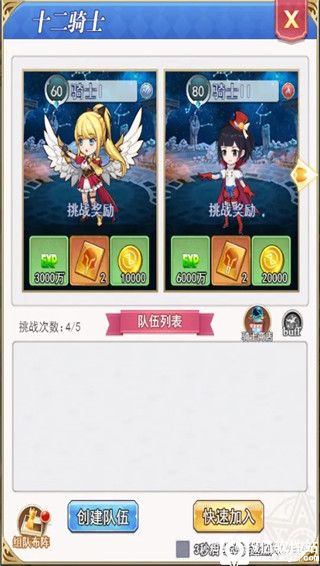 十二骑士挑战不仅是获取主角经验和金币,每天挑战5次。获取骑士之证可以在商店-骑士商店内兑换神装和各种突破道具,是前期除了挂机和组队挑战以外快速获取装备提升主角战斗力的方式之一。