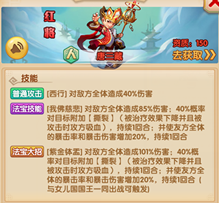 法宝技能:【我佛慈悲】对敌方全体造成85%伤害;40%概率对目附加【撕裂】(被治疗效果下降并且被攻击时功方吸血),持续1回合;并使友方全体的暴击率和暴击伤害增加20%,持续1回合