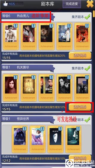 发起挑战后,系统随机给出三个挑战任务(有难有易),并标明当剧本挑战完成后,剧本属性将会获得怎样的提升(上图中由等级5进阶至等级6,用本组剧本拍摄电影场面属性在原有20%的基础上提升至21.5%),挑战时间限制为一周。