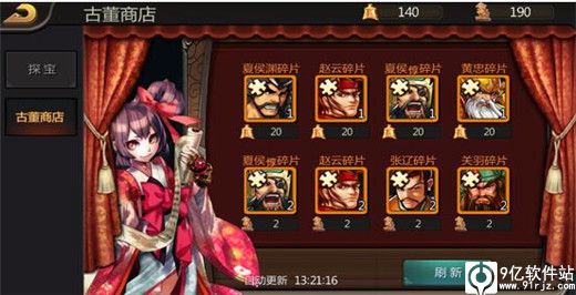 最后,探宝所得到的古币和古董,可去探宝系统单独设立的古董商店中,兑换所需的武将碎片。古董商店每天都会自动更新,玩家也可花费元宝,自己手动刷新。