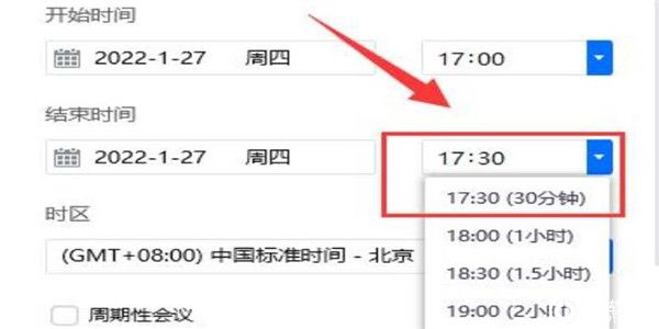 2、在会议时间处可以调整会议的起始时间,会议开始后通常是不会强制结束的,会议结束都需要用户手动关闭,所以只要不关闭会议也不需要手动延长时间。