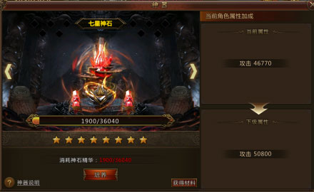 神石可以增加玩家攻击力,通过神石精华升级,材料主要通过双倍押镖和击杀BOSS获得。