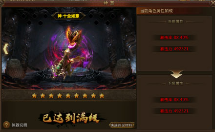 如意可以极大增加玩家的暴击率和暴击力,通过如意碎片升级,材料主要通过回收任务和天下第一活动获得。