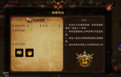 群雄夺宝活动每天两次,活动开始后,地图会出现一个BOSS,杀掉BOSS会爆一个宝箱,拿到宝箱的玩家每分钟都会获得随机奖励,活动结束后,获得宝箱的玩家打开宝箱会有很大几率获得100元宝,我们之前开宝箱,10次有9次都是元宝,开不到元宝的都是手黑的。