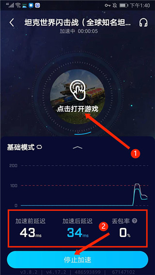 4、如图,已进入加速界面,可看到当前【加速延迟】和【丢包率】等详情信息,选择【点击打开游戏】可以进入游戏,如暂不需要,也可以选择下方【停止加速】,