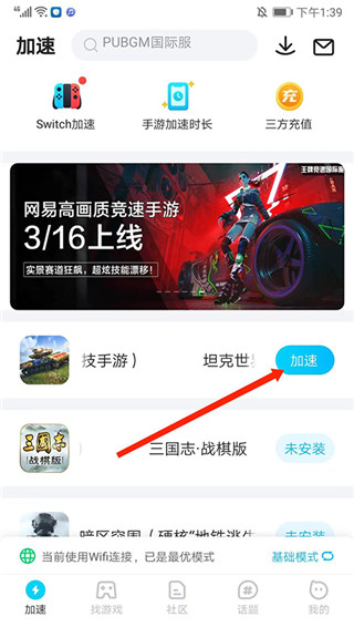 1、打开软件,登录后进入应用主界面,可看到一共分为【加速】、【找游戏】、【社区】、【话题】和【我的】栏目,