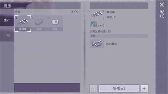 采完蘑菇后,我们点击左下角的“回家”图标即可快速返回庇护所,走到庇护所的厨房位置,点击“刀叉”的标志就能制作食物了。