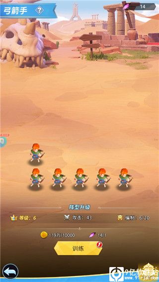 3、训练场,里面可以升级弓手等级,以用来增加城防,当然了,等级高推图也是很给力的,里面有远征军,也就是小兵…主升弓手…还有领军