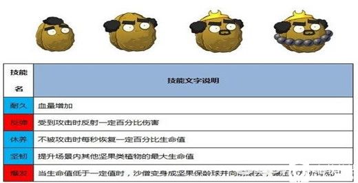 血量多,可以反弹所收的伤害,并且不被攻击的时候恢复血量,同时带动周围坚果类植物血量提高。