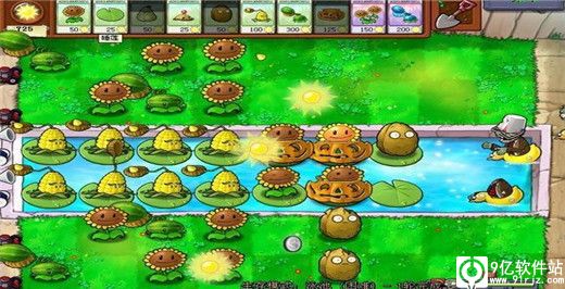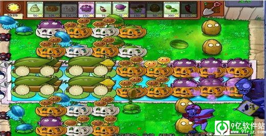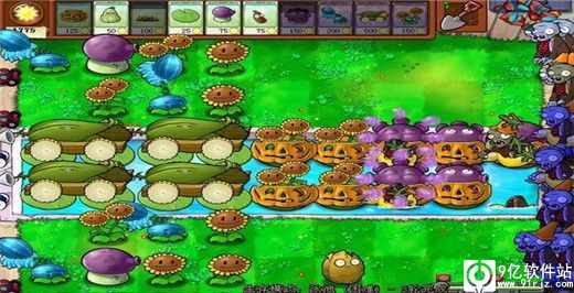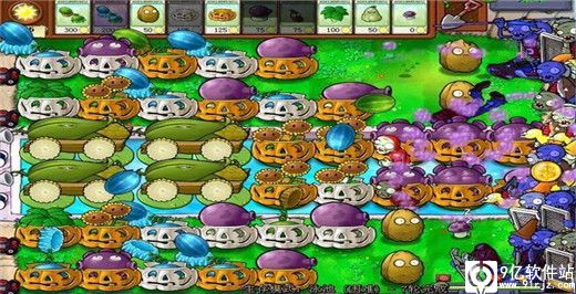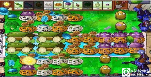 然后,过几关会出现扔小崽子的大僵尸,所以,如图所示,给倒数地2、3排首先套上南瓜罩,也就是从巨型僵尸来临之际,每关都要选上南瓜罩复制者,扔出的小崽子就交给后排的忧郁菇防守,这时候还是要节约阳光,所以不能选炸弹,选倭瓜就ok,其实要相信西瓜们的战斗力。