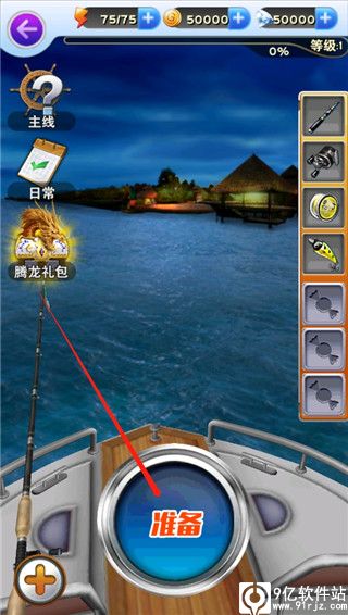 1、进入关卡后,点击装备开始钓鱼