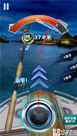 3、长按屏幕下方的圆形图标积攒怒气,当木器值满时,向上滑动屏幕抬竿