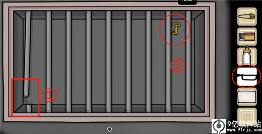用【铁锯】点左边豁口锯断,拿下得到【铁杆】,用【铁杆】杵一下钥匙拨到左边,得到【钥匙】。
