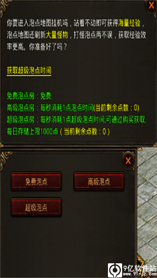 战神蚩尤手游中除了消耗经验丹升级之外还可以通过泡点地图来轻松提升等级,相较于打怪掉落的等级丹,泡点地图可以说是更快更适合提升等级的一种方法,从高级泡点开始都是有时间限制的,高级泡点时间可以通过完成悬赏任务、每日累充中进行活动,超级泡点则是需要消耗元宝进行购买泡点时间进入。
