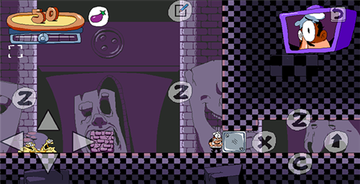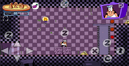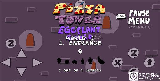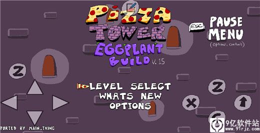 在本站中下载打开披萨塔茄子版游戏,LEVEL SELECT关卡选择,WHATS NEW更新内容,OPTIONS设置,Z按钮选择LEVEL SELECT