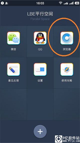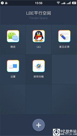 1、打开软件,进入应用主界面,界面下方有一个加号的图标,点击选择你要双开的应用。