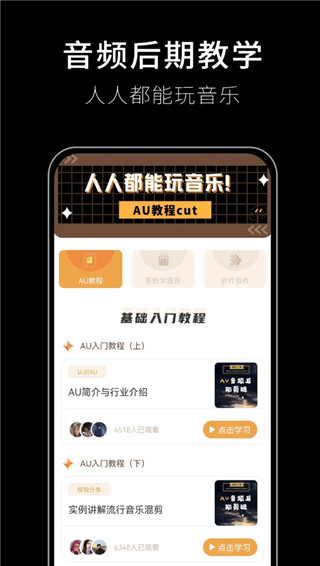 下载打开歌词适配app软件后,在首页有AU教程、混音学习的系统课程、音乐制作流程介绍等,可以学习到非常多的音乐混音剪辑知识。