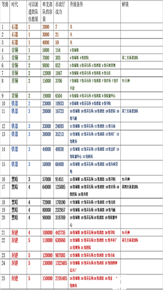 主堡,也就是市政厅,是前期游戏最重要的一个建筑物,以下就是升级条件以及升级后的改变。