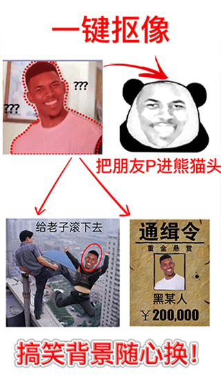 1、暴漫风格p图软件,可以将你的图片全部更改为暴漫的表情包2、可以使用大量的暴漫素材,包括金馆长、熊猫头等等