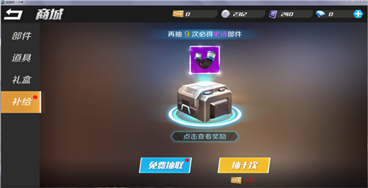 “补给”类似抽奖系统,为了感谢每一位参与到游戏中的小伙伴,系统每天会为大家提供一次免费的抽取机会,为了确保小伙伴们有所收获,每10次抽奖至少会获得一件史诗级的部件。