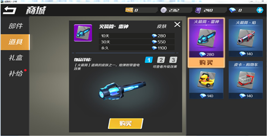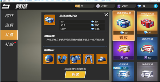 商城的售卖内容主要分为四个部分,分别是——部件、道具、礼盒和补给。