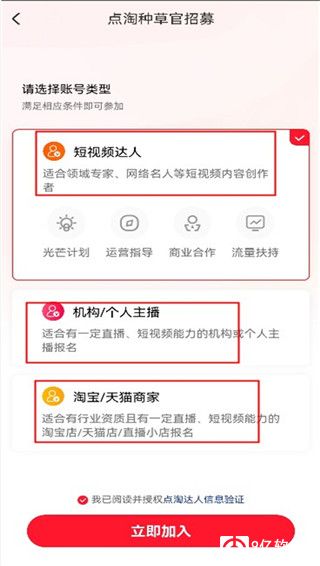 3、进入页面后用户可以选择自己的账号类型,然后点击立即加入。