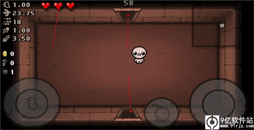 2、左边控制方向,右边控制攻击,左上角红心是你的命数,前往门前进入另一个房间开始战斗。