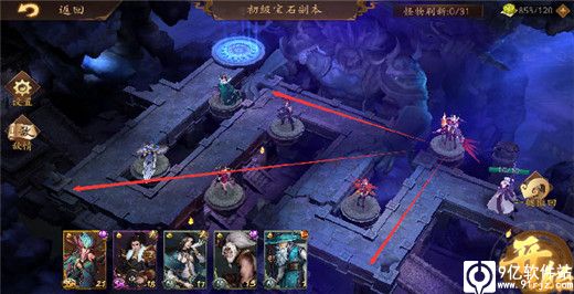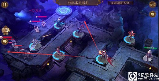 1、站在右下,蓄力满后可以像如图所示的方向释放大招,多次尝试方向,你会发现正在转弯的敌人可以受到两次伤害,注意要优先击杀眩晕怪物哦。