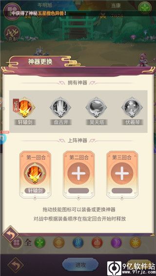 神器入场:神器会在特定的回合数使用神器技能,可在战斗对目标造成真实伤害帮助玩家进行战斗。