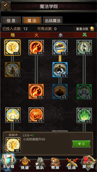 分为地、火、水、风四种属性。一个技能点学习一次,五次学满方可学习下一技能。不同的属性有不同的战力加成。