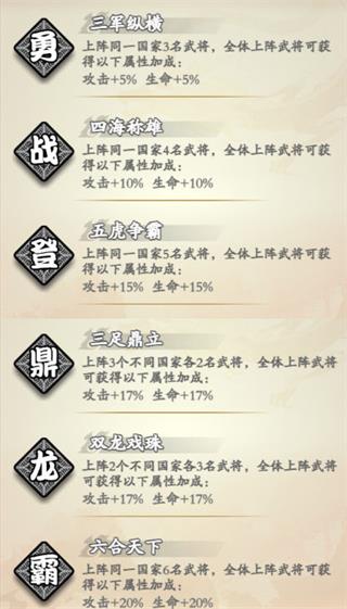 大家好~小飞飞今天将教给你们如何在初期应当如何配置阵容来最大化利润。首先我们先让看一下武将阵营的效益效应,六名同阵营的“全界九霄”是最有力的效果。然而,小飞飞不建议你们在初期就强行追求这个牵制效果,因为在初期武将不足的情况下,小飞飞更推荐运用属性差异较小的“三国鼎立”效果,以此来最好地配合我们初期武将最大化的获取资源。