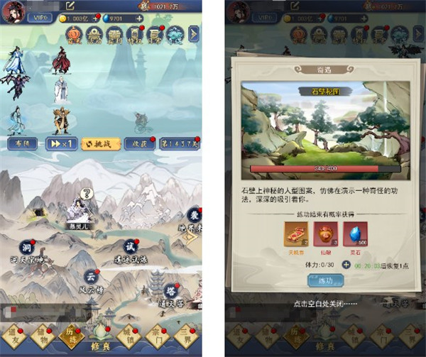 3、采用水墨画风营造出了一个充满东方韵味的修仙界,加上皮影戏般的角色立绘,传统艺术的相互融合,将带来不一样的视觉盛宴。在这里,你将体验到从泼墨山水间修行成仙的神秘感。
