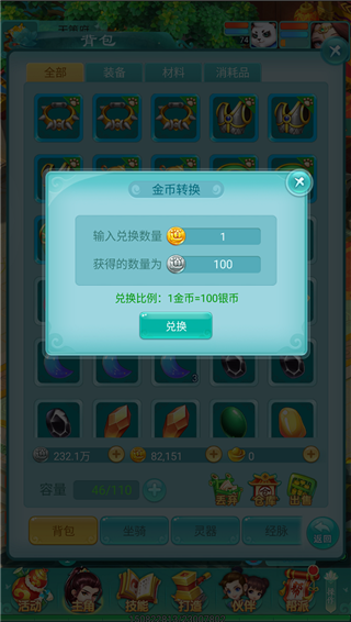 金币和银币是可以进行兑换的,不过只能由金币兑换成银币,却不能将银币兑换成金币。按照汇率,1金币可以兑换100银币,有时候银币不够用了,用金币去兑换也不失为一种快速解决问题的方式。