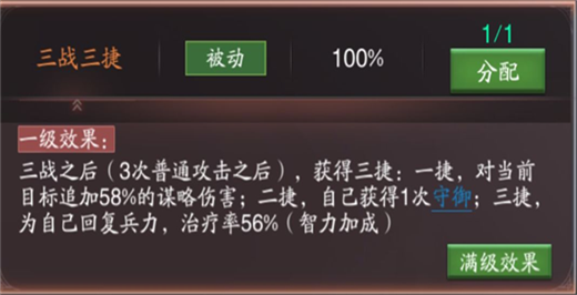 马超携带【劫掠】【三战三捷】。马超本身【纵马挺枪】作为核心技能能够增加aoe范围伤害,携带【三战三捷】配合主技能可以做到三战九捷的效果,为马超自身添加3次守御与三次治疗,并且增加伤害(本伤害为谋略伤害,不会很高),【劫掠】作为追击技能,选中的原因便是本技能既能打出高额伤害还可以提供搅乱效果为主技能提供伤害增加。
