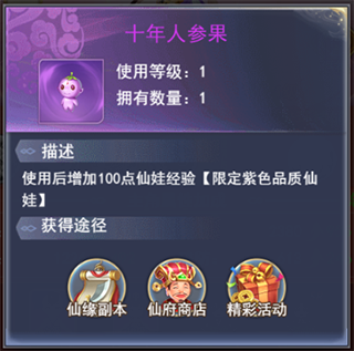 而人参果则是促使他们成长,提升仙龄的道具(人参果与仙娃的品质相同时方可使用)。