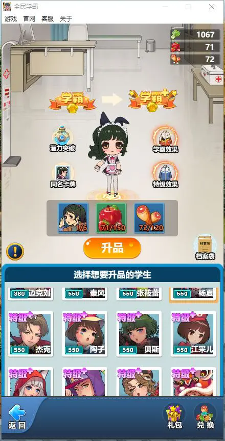 学生升品是在保健室内完成的,在保健室里我们可以清楚地了解每种资源的具体价值。在保健室右下角的“兑换”处可得知1水果=8蔬菜,1鸡腿=8水果。在卡牌分解的时候,可得知1普通卡=8蔬菜,1优秀卡=8水果,1精英卡=8鸡腿。
