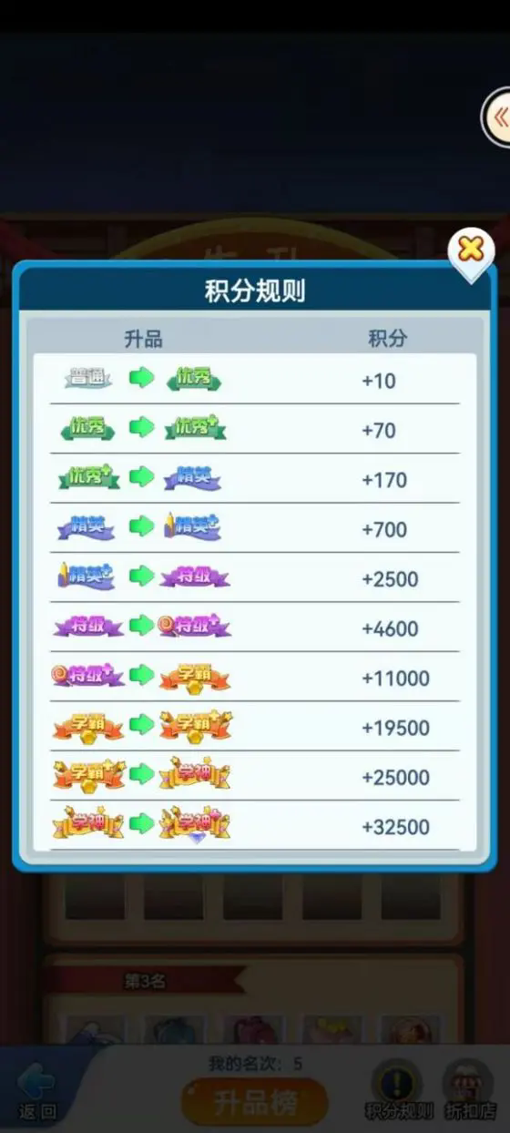 升品的积分不需要我们计算,学生升品冲榜活动开始后,点击进入规则,我们就可以看到相应的积分规则,具体规则如下图所示。